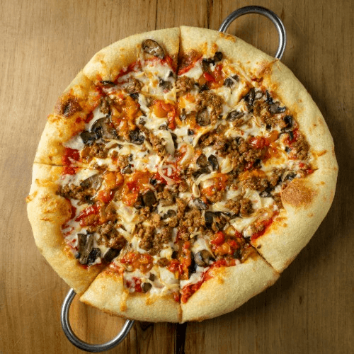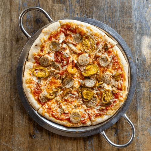 mozzarella-provolone cheese blend, peperonata, Italian sausage crumble, roasted mushrooms, sweet onions