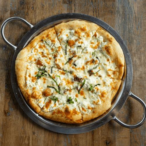 mozzarella, basil, mushrooms, red bell pepper, sweet onion, artichoke, balsamic reduction, pesto, ricotta base