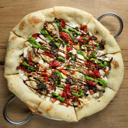 mozzarella, mushroom, red bell pepper, sweet onion, artichoke, balsamic reduction, basil pesto