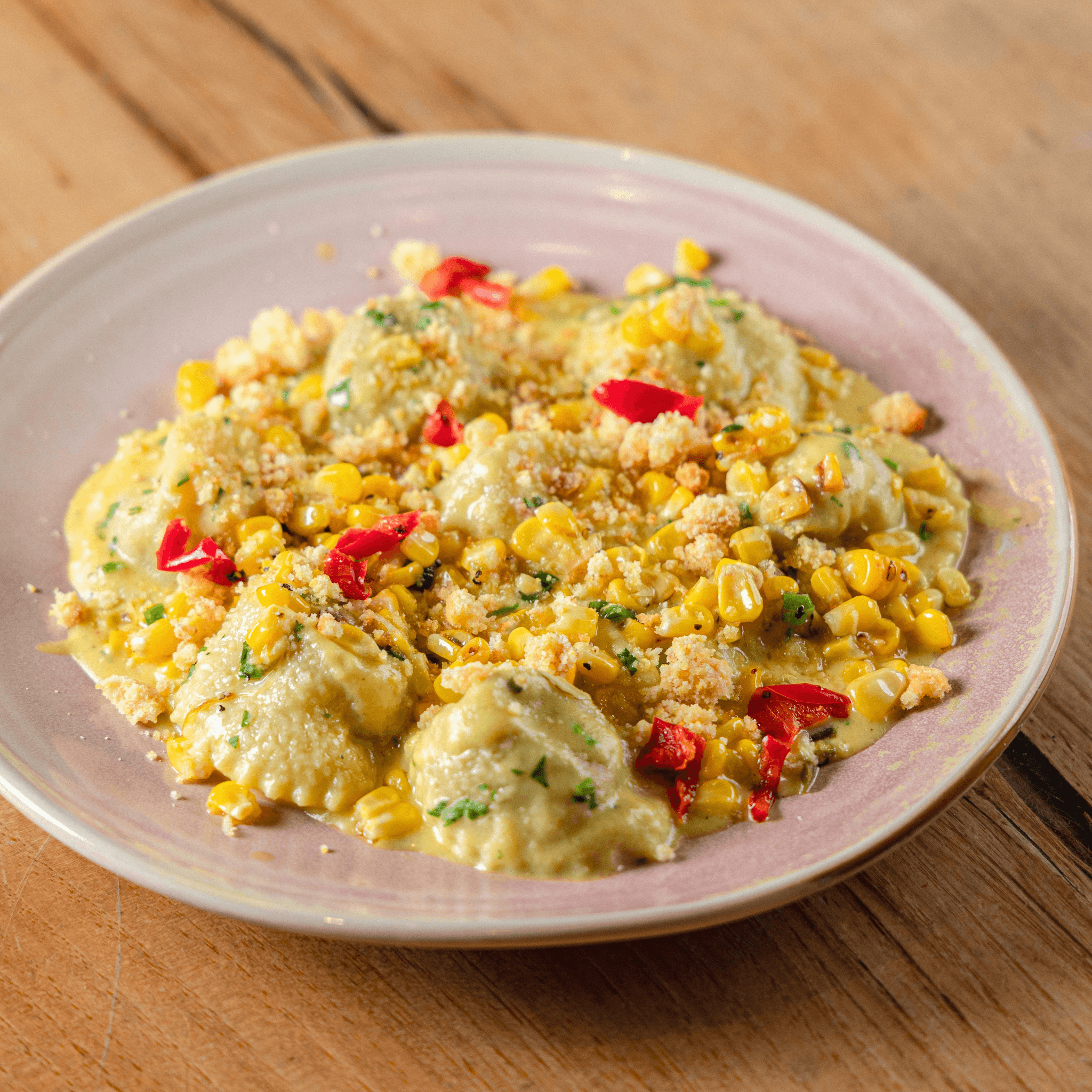 brisket, horseradish, corn crema, corn salad, corn bread crumble