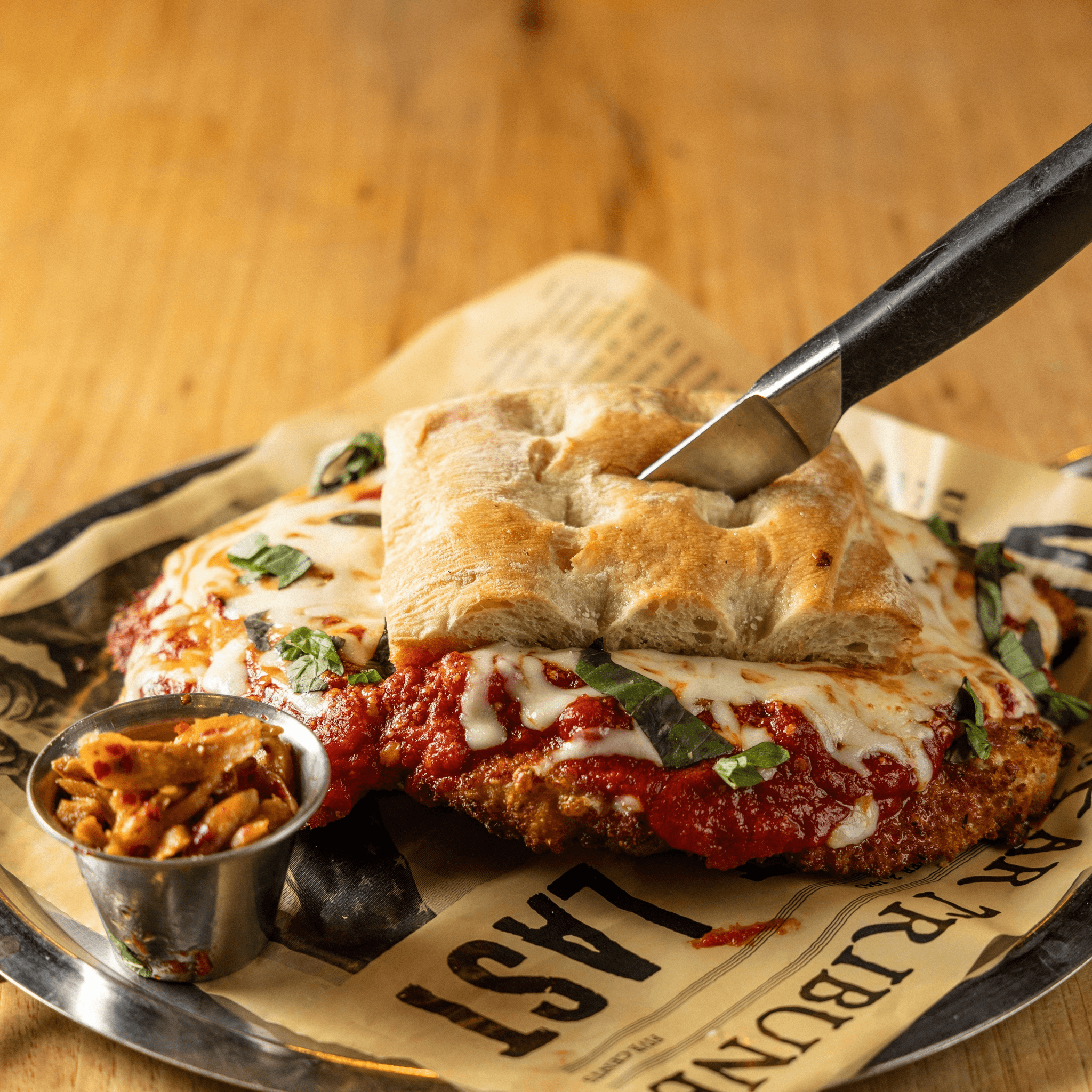 hero sized chicken cutlet, tomato sauce, mozzarella, focaccia *a portion of sales go to the Spirit of a Hero Foundation*
