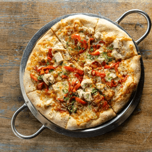 mozzarella, smoked chicken, roasted pepper, onion, cilantro, BBQ sauce