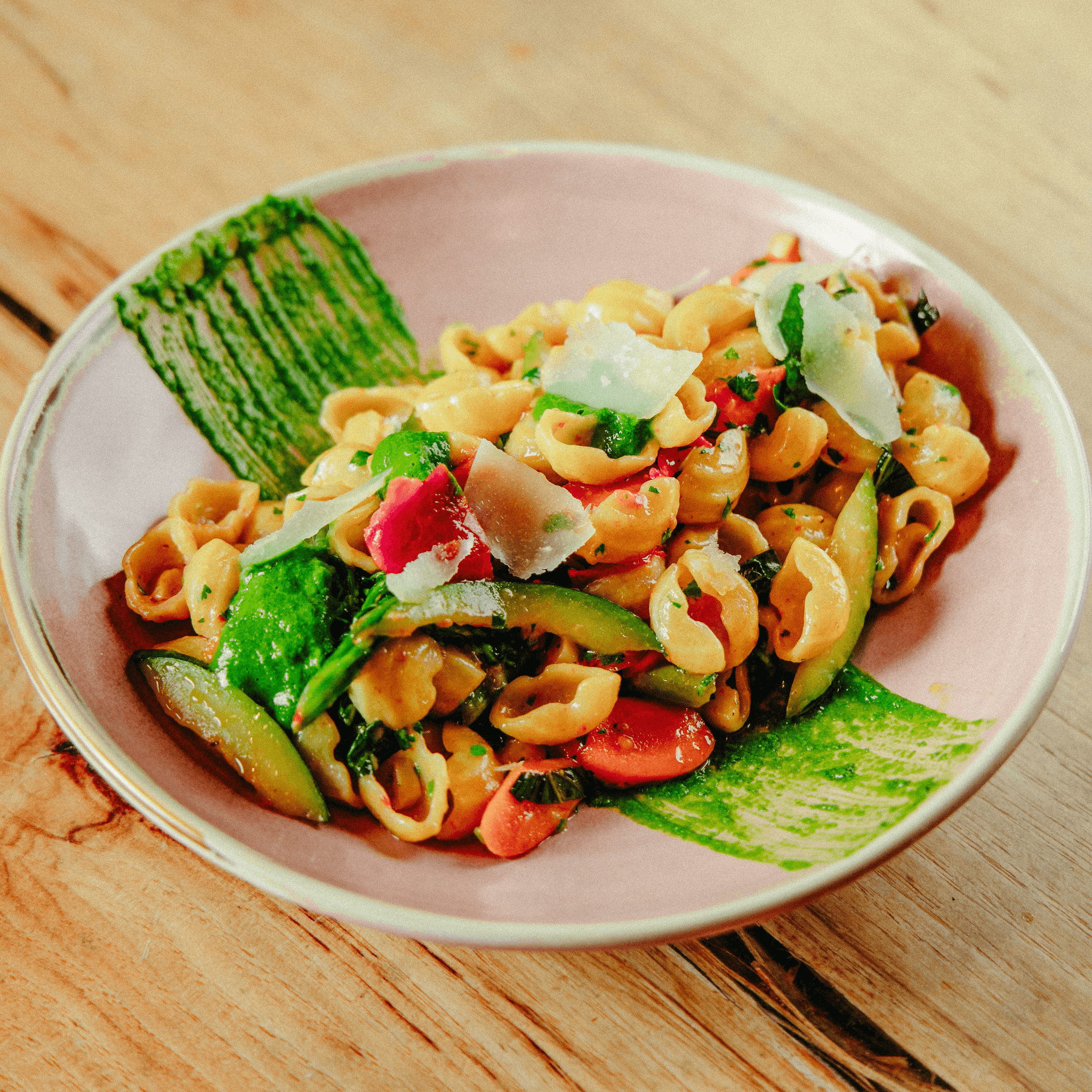 zucchini, tomato, broccolini, bell pepper, carrots, lemon, basil, EVOO, parmesan